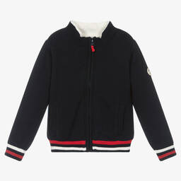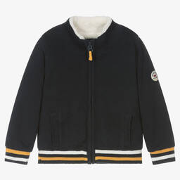 Reversible, hooded zip-up top for boys and girls by French brand Week-end à la mer. One side is made in cotton jersey in the brand's signature navy blue and white Breton stripes with the brand's red fish logo embroidered on the chest. The other side is made in soft and cosy navy blue faux fur fleece. Can be worn as a lightweight everyday jacket, both sides have a small logo tab on one sleeve.
