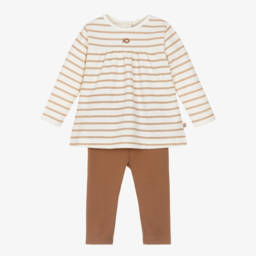 Navy Blue and ivory striped cotton leggings outfit for girls by Week-end à la mer, suitable for cosy autumn days. Crafted from soft jersey, the top features classic Breton stripes with a charming appliqué heart and lobster detail, complete with convenient popper fastenings at the back. The leggings, in a comfortable full-length design, have an elasticated waist for ease of wear. Limited quantities available, making it a delightful addition to any wardrobe.