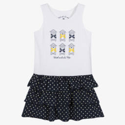 A classical white dress for girls by Week-end à la mer, made in soft cotton jersey. Patterned in a retro floral design, this casual racerback dress has pretty ruffled trims, with a diamanté fish logo on the chest. Easy-to-wear and style, there are useful popper fastenings on the back.