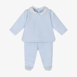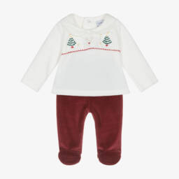 An ivory 2 piece babygrow for little boys by Babidu, made in soft cotton-blend piqué. Classically styled, the top features a sweet Peter Pan collar and delicate smocking across the chest. It fastens neatly with poppers on the back. The matching trousers have enclosed feet to keep little toes warm and an elasticated waist for a comfortable fit.