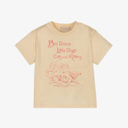 Off-white cotton T-shirt for boys and girls by luxury Italian brand Gucci. It has a distressed gold, green and red vintage logo, inspired by the men's and women's ready-to-wear collections. It is made from soft, lightweight jersey with a ribbed neckline.