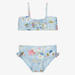 The girls blue multi frill bikini by Zimmermann features a beautiful blend of floral designs in blue, pink, and beige tones. Crafted with silky, stretchy fabric, it offers both comfort and style. The bikini is lined, ensuring a soft feel against the skin, and adorned with delicate crochet-trimmed ruffles for a charming touch. Ideal for beach days, this vibrant bikini is a must-have for the season. Limited quantities are available, so seize the opportunity to add this exquisite piece to your collection.