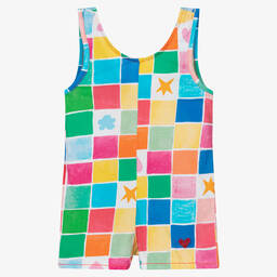 A pink & blue cotton playsuit for teen girls by luxury brand Zimmermann, in a vibrant floral design. This playsuit has frilly trims, ivory floral embroidered trims, and a tie drawstring waist for gorgeous resort wear styling. There are pearlescent button fastenings on the chest.